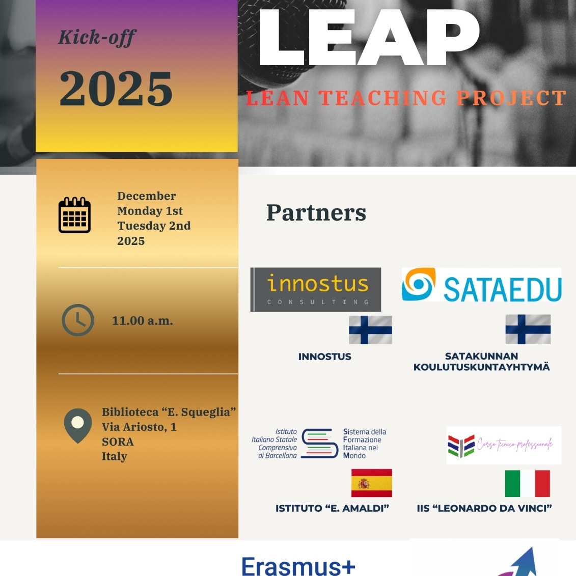 Siamo orgogliosi di annunciare che la scuola italiana di Barcellona partecipa per la prima volta a un progetto ERASMUS con capofila la Finlandia. Argomento del progetto è apprendere la metodologia LEAN per migliorare l’apprendimento e per rendere l’insegnamento più efficace. La prima mobilità con alunni e docenti si è svolta in Italia a Roma e a Sora (FR).